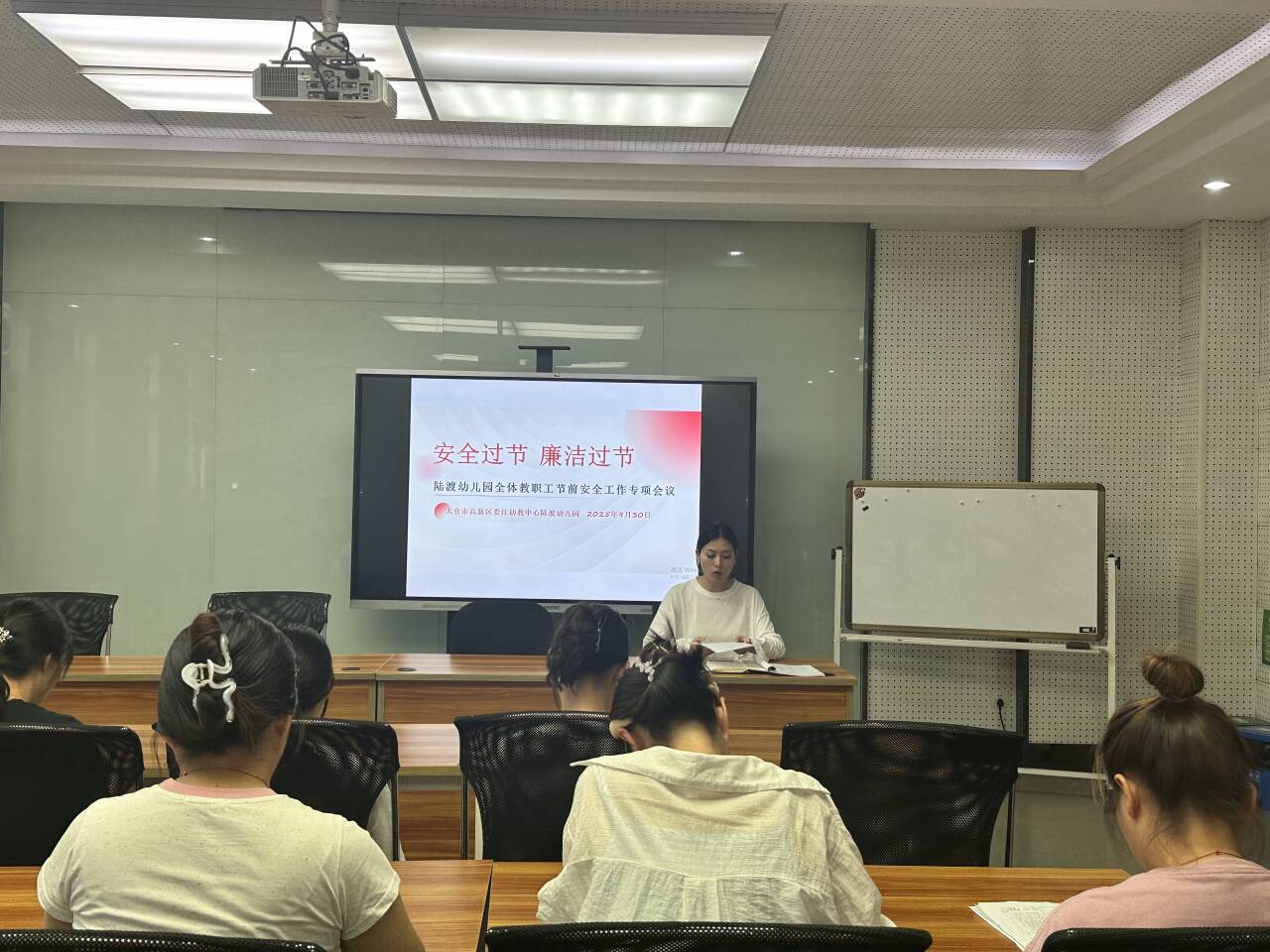 为切实做好国庆、中秋“双节”期间校园安全保障工作,深入贯彻落实上级部门关于廉洁过节的工作要求,2025年9月30日,太仓市高新区娄江幼教中心陆渡幼儿园召开全体教职工安全与廉洁过节动员会议。本次会议由李燕华园长主持,全体教师及后勤人员参会学习。