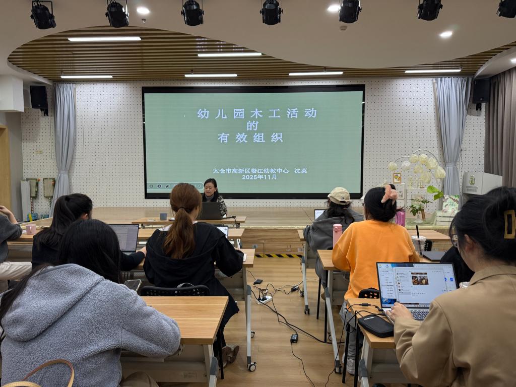 沈英主任则带来了“幼儿园木工活动的有效组织”及“幼儿园微课程的有效开展”两场讲座。在木工活动组织方面,沈主任指出木工活动能锻炼幼儿的精细动作、认知与问题解决能力、创造力与想象力等,她提出了丰富感性经验、积累基本方法、师幼共同合作及展示评价等组织策略。在微课程开展方面,沈主任强调微课程应来源于幼儿兴趣、周边资源及原课程计划,聚焦幼儿发展,提高教师素养。