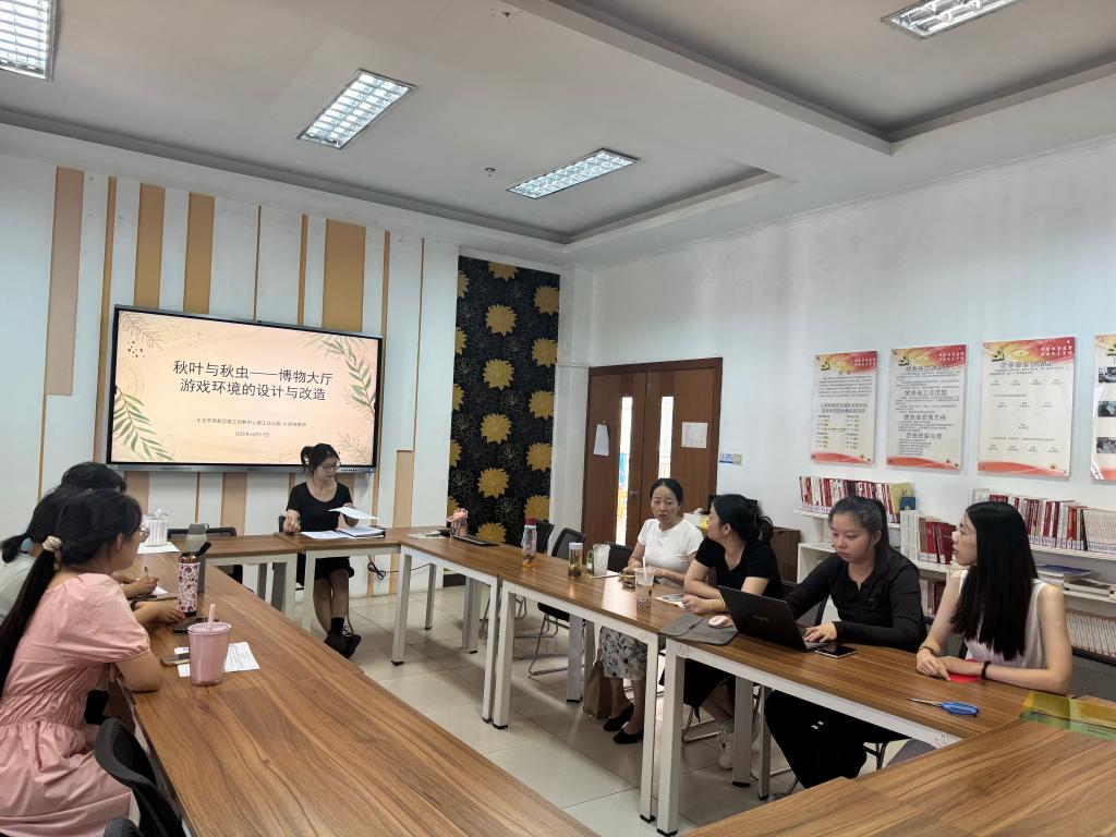 教研现场,教师们围绕“如何让自然元素成为小班幼儿的游戏探索载体”展开讨论:从幼儿收集的枫叶、银杏叶等秋物出发,结合“博物大厅”的场景定位,梳理出“幼儿主导分区”“低结构材料搭建展台”“预留动态补充角”等布置思路,同时明确将“秋物保护”“自然探究”等教育目标融入环境创设过程。