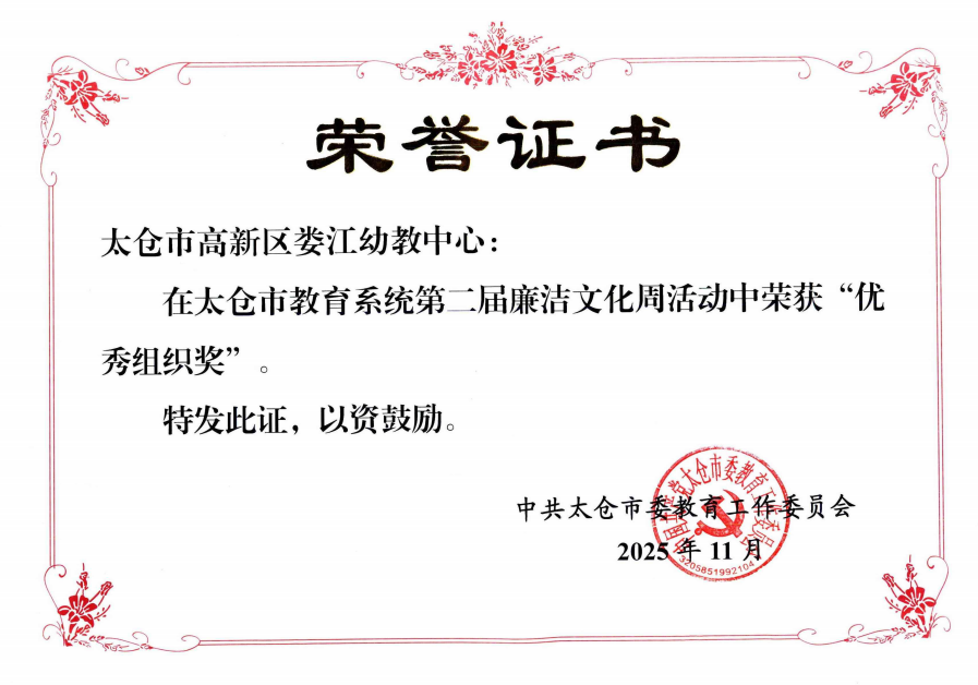 高新区娄江幼教中心喜获太仓市教育系统第二届廉洁文化周活动“优秀组织奖”