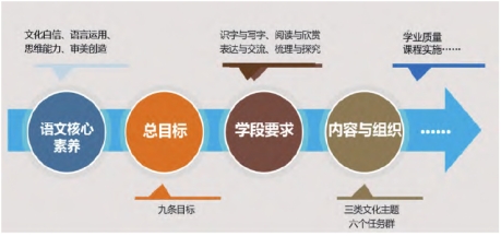 围绕核心素养提出学科课程标准,是义务教育新课程标准的特征。以语文为例。语文课程标准提出的核心素养概括起来有四点。(1)文化自信:对中华文化有认同感,对中华文化的生命力有信心,包括文化认同、文化积淀、文化理解、文化参与等。(2)语言运用:具备良好的语感,能有效交流沟通,对国家通用语言文字有深厚感情等。(3)思维能力:能在语文学习过程中联想想象、分析比较、归纳判断等,有好奇心、有求知欲、有积极思考的习惯等。(4)审美创造:能感受、理解、欣赏、评价语言文字及作品,发现美,创造美等。语文课程标准围绕这些核心素养提出了总目标、学段目标要求以及课程内容与组织、课程实施等方面的具体要求(见图1)。