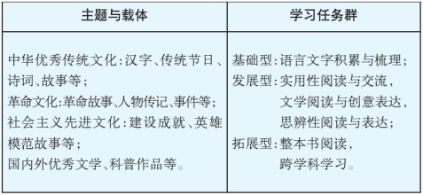 又如,从课程内容来说,义务教育语文新课程标准中提出的语文学习的“主题与载体”“学习任务群”等(见表4),在幼儿园教育实践中也有比较充分的体现。且不说有关“主题与载体”是幼儿园语言领域和社会领域的主要学习内容,即使是比较新颖的“学习任务群”,如“文学阅读与创意表达”“思辨性阅读与表达”“整本书阅读”“跨学科学习”等,在《指南》语言领域的学习与发展目标中也已有涉及,如“能根据故事的部分情节或图书画面的线索猜想故事情节的发展,或续编、创编故事”“对看过的图书、听过的故事能说出自己的看法”等。在实践中,教师们不仅带领和支持、鼓励幼儿进行“整本书阅读”,也常常引导幼儿在阅读过程中进行思考、讨论、续编、创编等。此外,一些幼儿园开展的儿童“撰写”自己的游戏故事、做日常观察记录等活动,无疑也相当于幼儿版的“跨学科”语言学习。