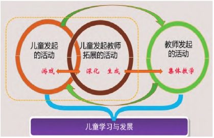 教师的作用:主导。帮助儿童获得自发学习中所不能或不易获得的学习经验,或者帮助儿童梳理、提升自发活动及生活中获得的原有经验,并促进经验的迁移(将它们运用于新情境、解决新问题);体现“教学要走在发展前面、引领发展”(维果茨基)的思想,推动教育“公平”①。