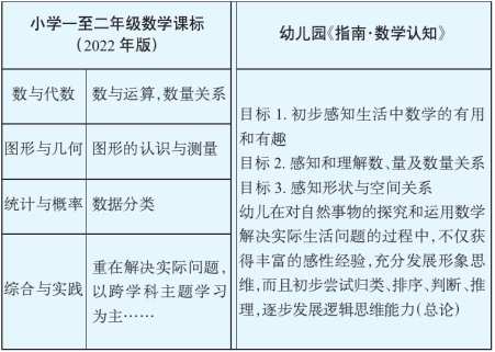 《纲要》和《指南》作为国家有关幼儿园课程的文件,不仅在学习与发展目标方面反映了入学准备的要求,也在一定程度上体现了与小学课程的衔接。事实上,专家组在研制《指南》的过程中是充分参考和对照了小学低年级的课程标准(2011年版)的,如《指南》五个学习领域及子领域的目标、内容等与小学(一至二年级)的品德与生活、语文、数学、体育与健康、艺术等都有一定的对应和联系。对照2022年版课程标准一至二年级部分,依然可以看到这种关系的存在。下面以数学为例加以说明(见表2)。