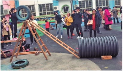 例如,儿童自己设计了一个钻隧道的游戏,其基本玩法是将轮胎推到由梯子搭成的斜坡的顶端,然后放手让轮胎滚进并穿越下面的“隧道”(见图7)。为了实现这个目标,儿童需要解决不少问题:怎样将一个很重的轮胎举上去,并且保持身体的平衡?怎样搭出一个方便上下、能站稳且高度合适、有利于将轮胎举到“轨道坡顶”的平台?选择多大直径的轮胎更容易使其钻进“隧道”?还可以添加些什么设施让这个游戏更好玩、更有挑战性?可见,从游戏设计到实施的每一步都需要儿童一起思考、探索、试验,也都蕴含着深度学习的机会。